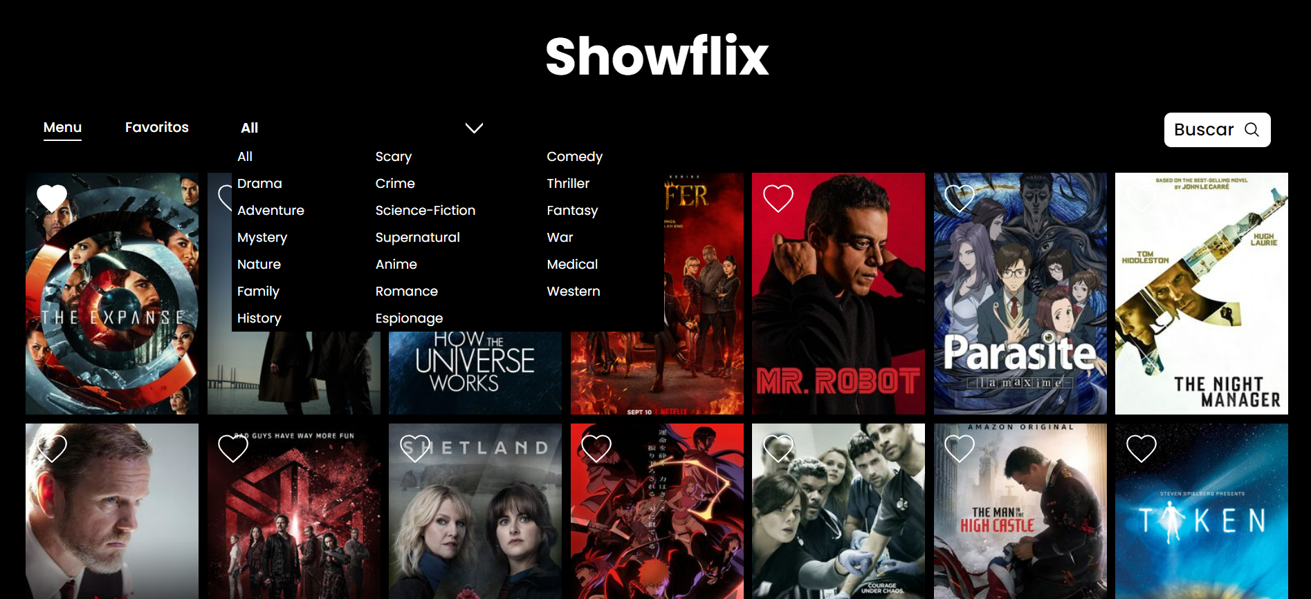 SHOWFLIX is a website, where you can get information about thousands of films and series, the seasons, the chapters and the main actors. It is by far a more ambicious project, consuming a huge API, where I needed to make use of React Router to create the different sections of the sites.