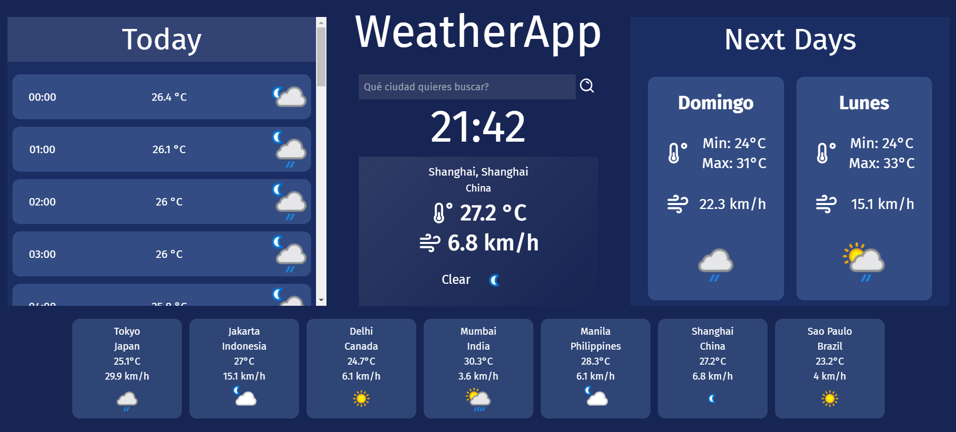 Weather App is an application for weather, which lends you to obtain information about the forecast of every city of the world. It is made in React and styled with Tailwind CSS. During the development I went through the process of consume an Weather API and a Cities API too, learn how to process theirs data and make an interesting and funcional UI, giving information at disposal of the user.
